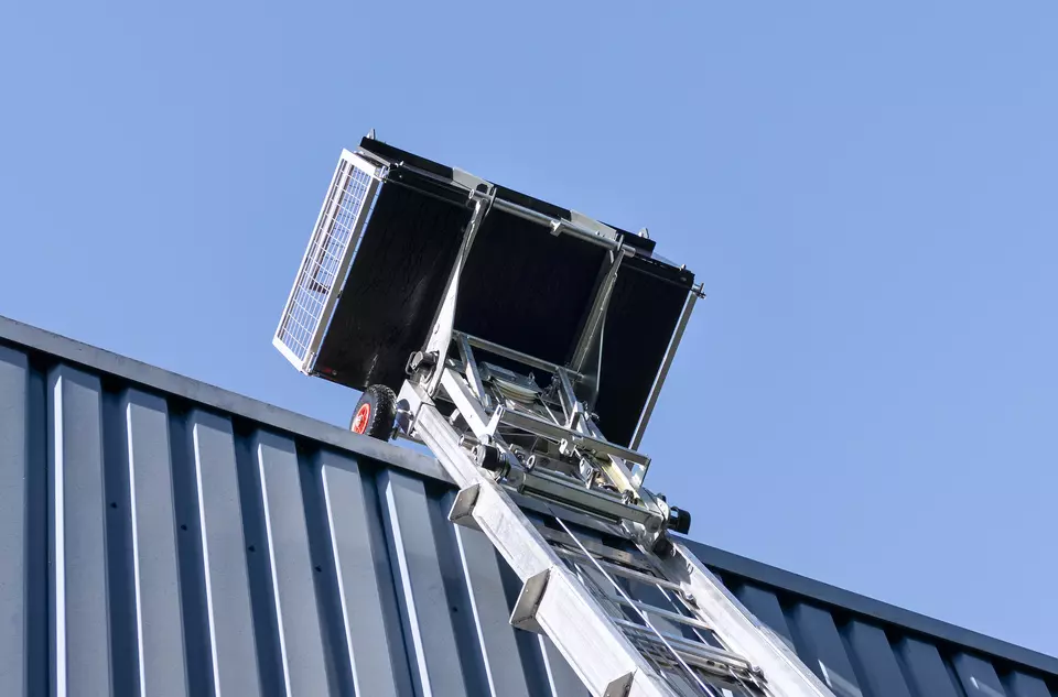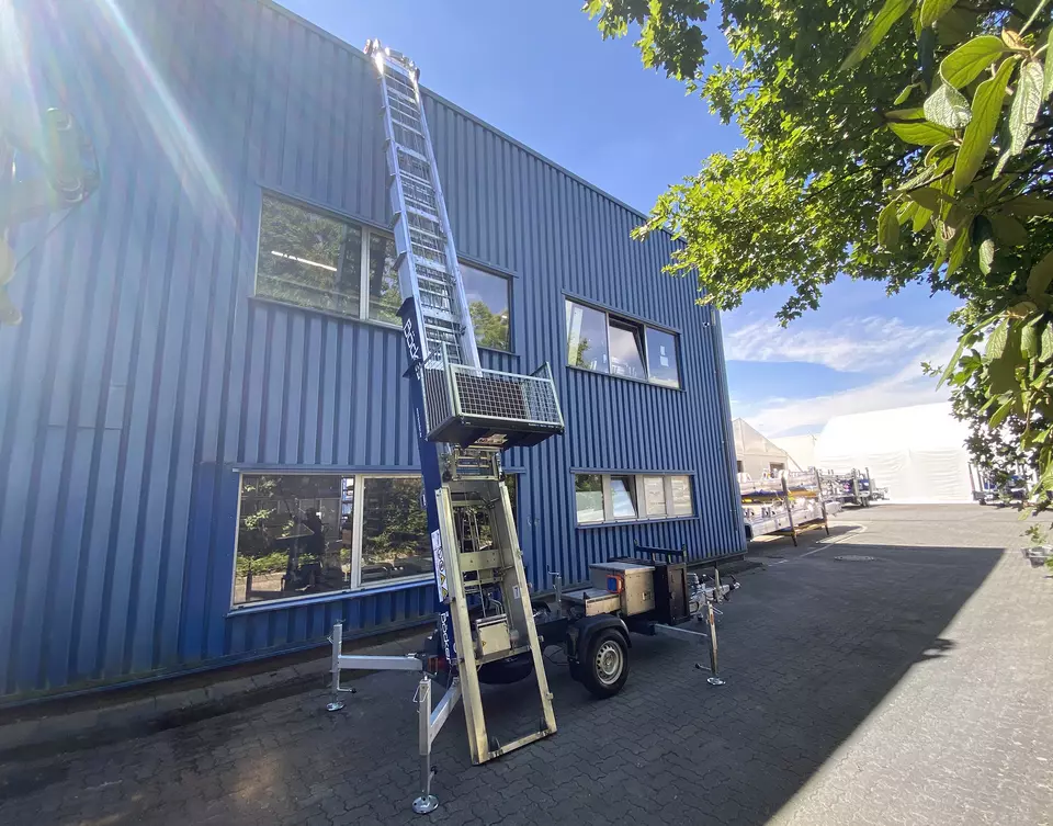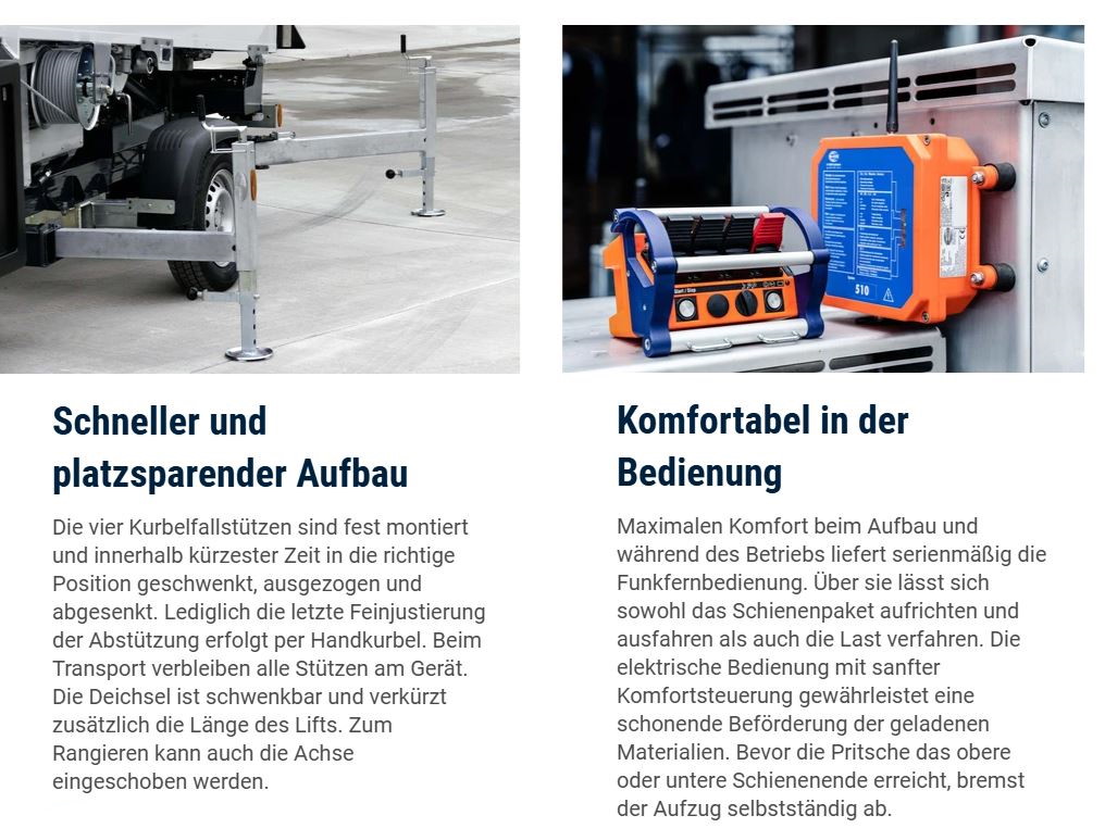 Der Junior 24 punktet mit seinem innovativen Fahrgestell für einen platzsparenden, schnellen Aufbau innerhalb weniger Minuten. Dank seiner Kompaktbauweise mit stabilen Führungsschienen aus Spezialaluminium findet der Schrägaufzug auf engstem Raum einen Stellplatz und kann durch sein geringes Eigengewicht von allen gängigen PKW gezogen werden. Die optional schwenkbare Deichsel verkürzt die Länge des Aufzugs. Die vier Kurbelfallstützen sind fest montiert und innerhalb kürzester Zeit in die richtige Position geschwenkt, ausgezogen und abgesenkt.