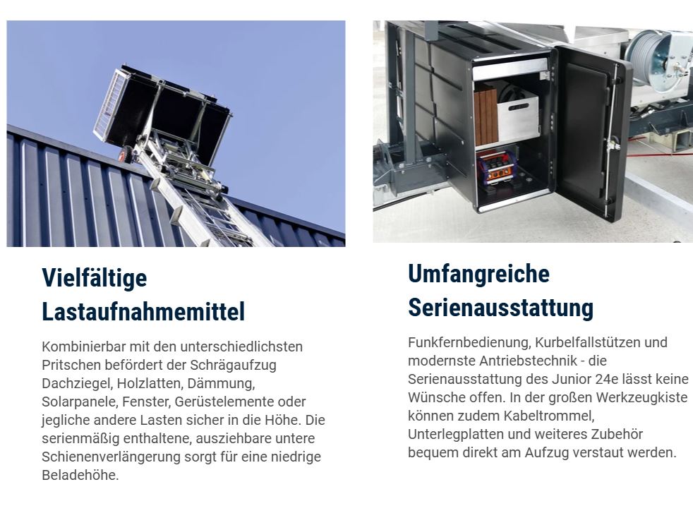 Als elektrisch betriebene Variante lädt der Junior 24e an jeder Schuko-Steckdose und arbeitet auch an Orten ohne Stromanschluss. Ausgestattet mit E-Motor und modernster Lithium-Ionen Akkutechnologie befördert der Schrägaufzug Lasten bis 250 kg nicht nur schnell, leise und emissionsarm, sondern auch umweltschonend in Höhen bis 24 m. Ist der Aufzug während des Betriebs eingesteckt, bleibt sein Akku stets auf einem gut gefüllten Niveau. Sollte nach mehreren Stunden ohne externe Stromversorgung die Akkukapazität dem Ende entgegen gehen, lädt der Bauaufzug innerhalb einer Stunde zurück auf 80 %. Ein Display am Aufzug gibt jederzeit Auskunft über den Füllstand des Akkus und den Betriebszustand des Geräts.